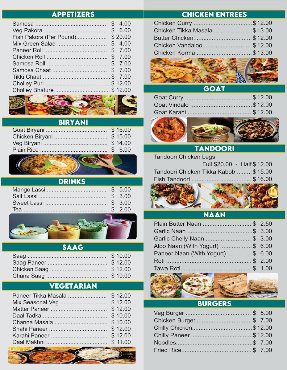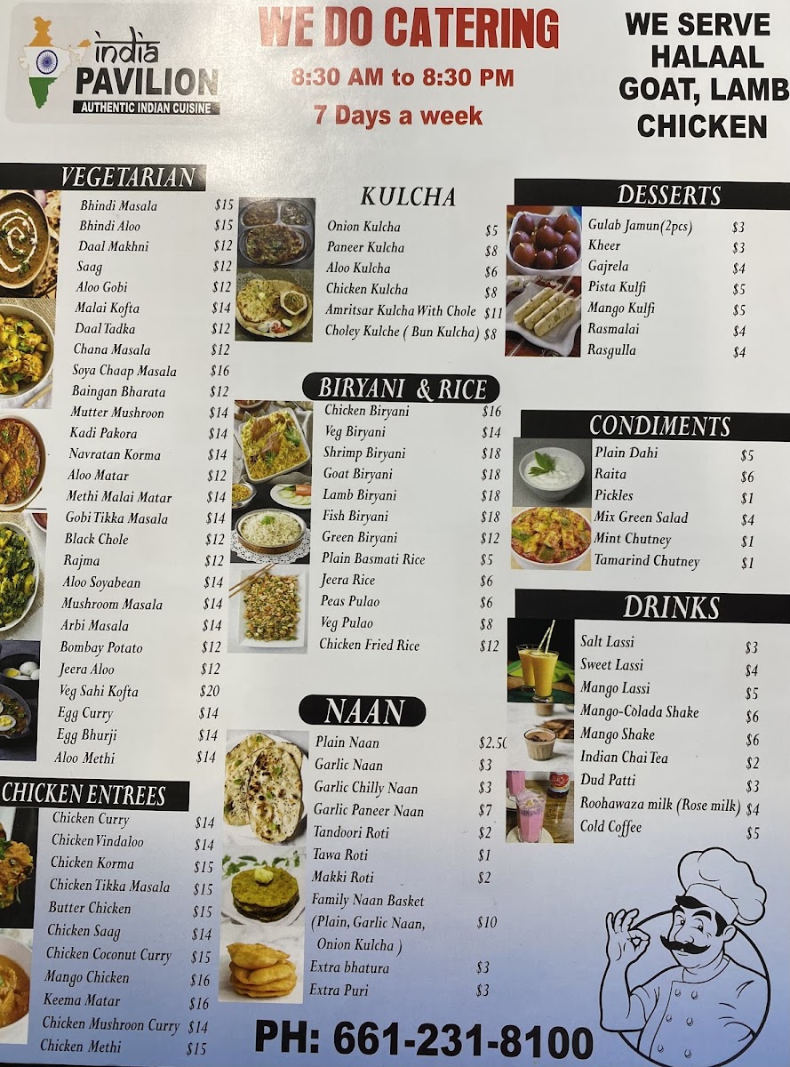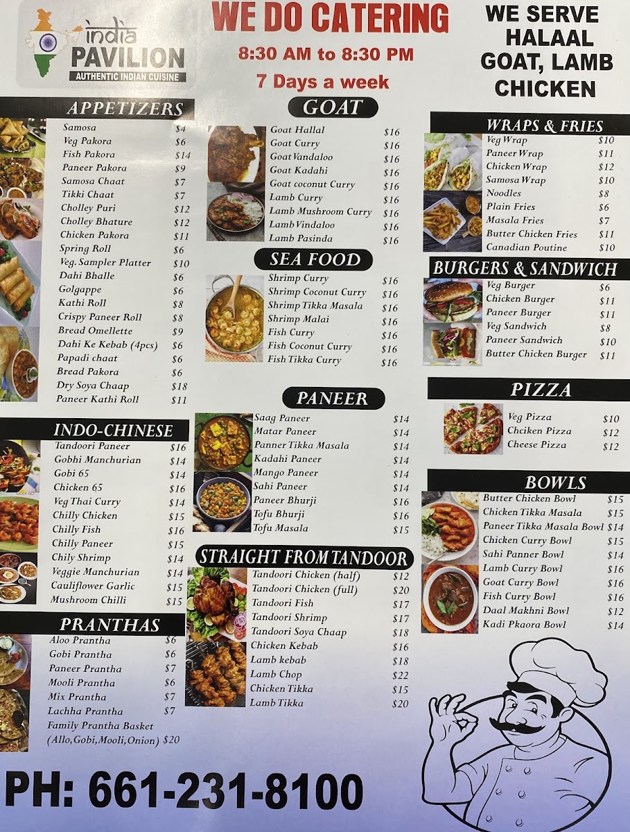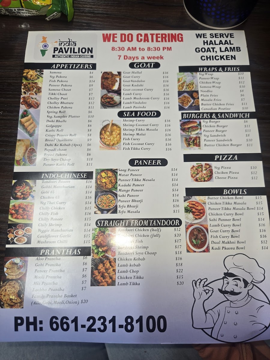 In conclusion, the menu at India Pavilion offers an impressively diverse selection that captures the richness of Indian cuisine, from hearty goat dishes like Goat Karahi and Goat Vindaloo to flavorful rice options such as Shrimp Biryani and Jeera Rice. The tandoori section stands out with items like Tandoori Chicken Legs and Tandoori Fish, while comforting classics like Chicken Tikka Masala, Chicken Korma, and vegetarian staples such as Shahi Paneer and Daal Makhani round out the main entrées. There’s also a fun fusion twist with items like Paneer Burger, Veggie Noodles, and Indo-Chinese favorites like Chilly Chicken and Gobi Manchurian. Seafood lovers can enjoy dishes like Shrimp Tikka Masala and Fish Coconut Curry, while the variety of breads including Garlic Naan and Paneer Prantha perfectly complement any meal. To finish, traditional desserts like Gulab Jamun and Mango Kulfi, along with refreshing drinks such as Mango Shake and Sweet Lassi, provide a satisfying end to the experience. Overall, the menu feels both extensive and thoughtfully curated, appealing to a wide range of tastes.